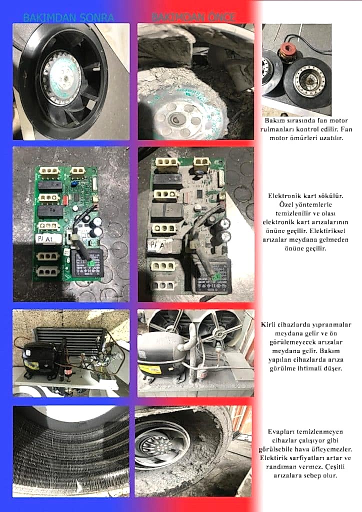 - Evaporatör ve kondanser basınçlı su ve kimyasal solüsyonla temizlenir.